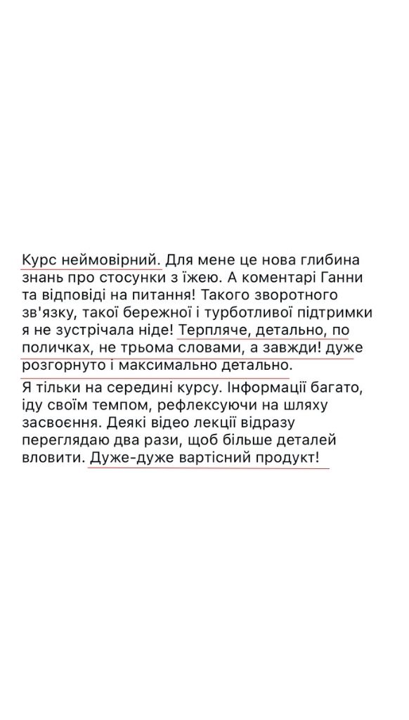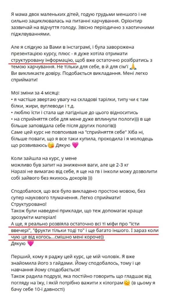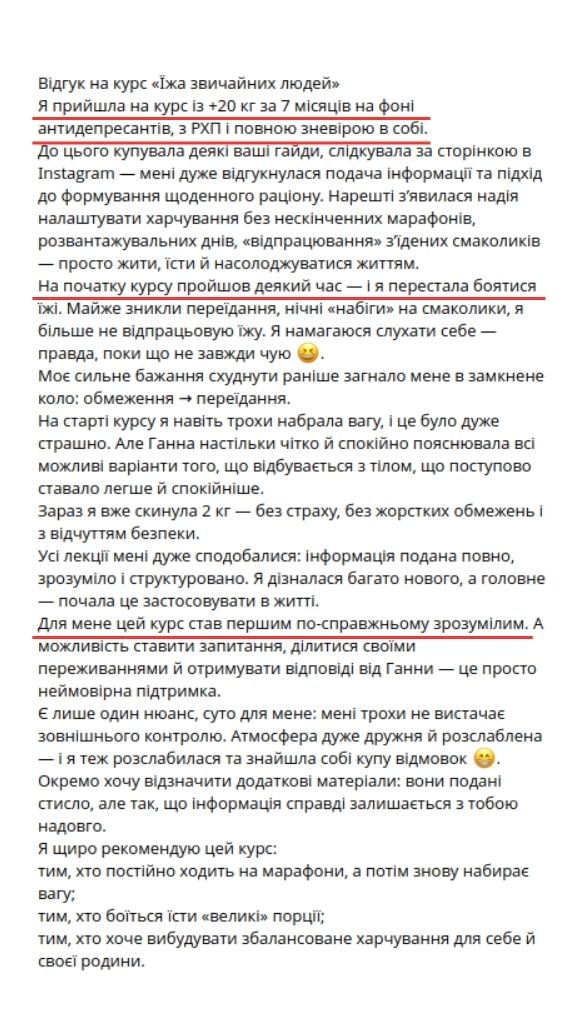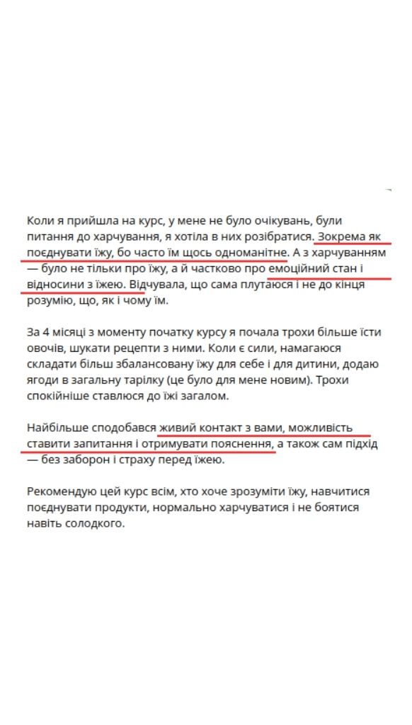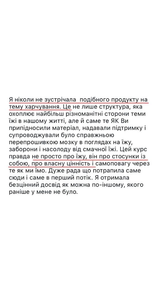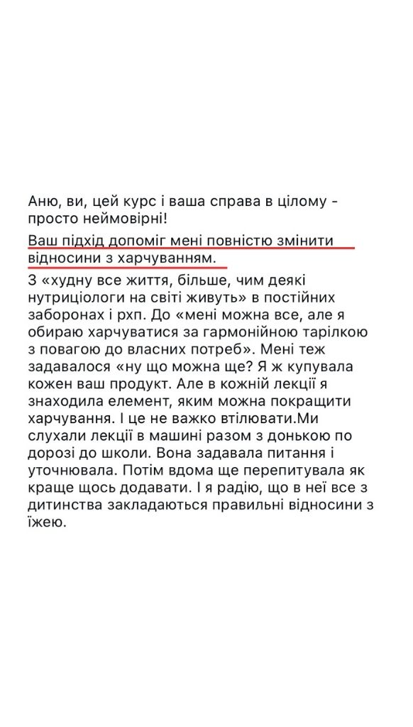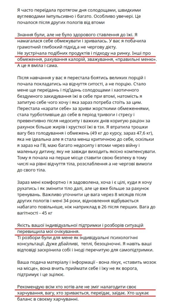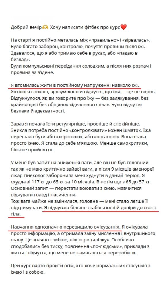 — Пройшла шлях від переїдань, порушень харчової поведінки, екстра-ваги +20 кг і проблем зі здоровʼям до комфортного збалансованого харчування і здорового тіла.